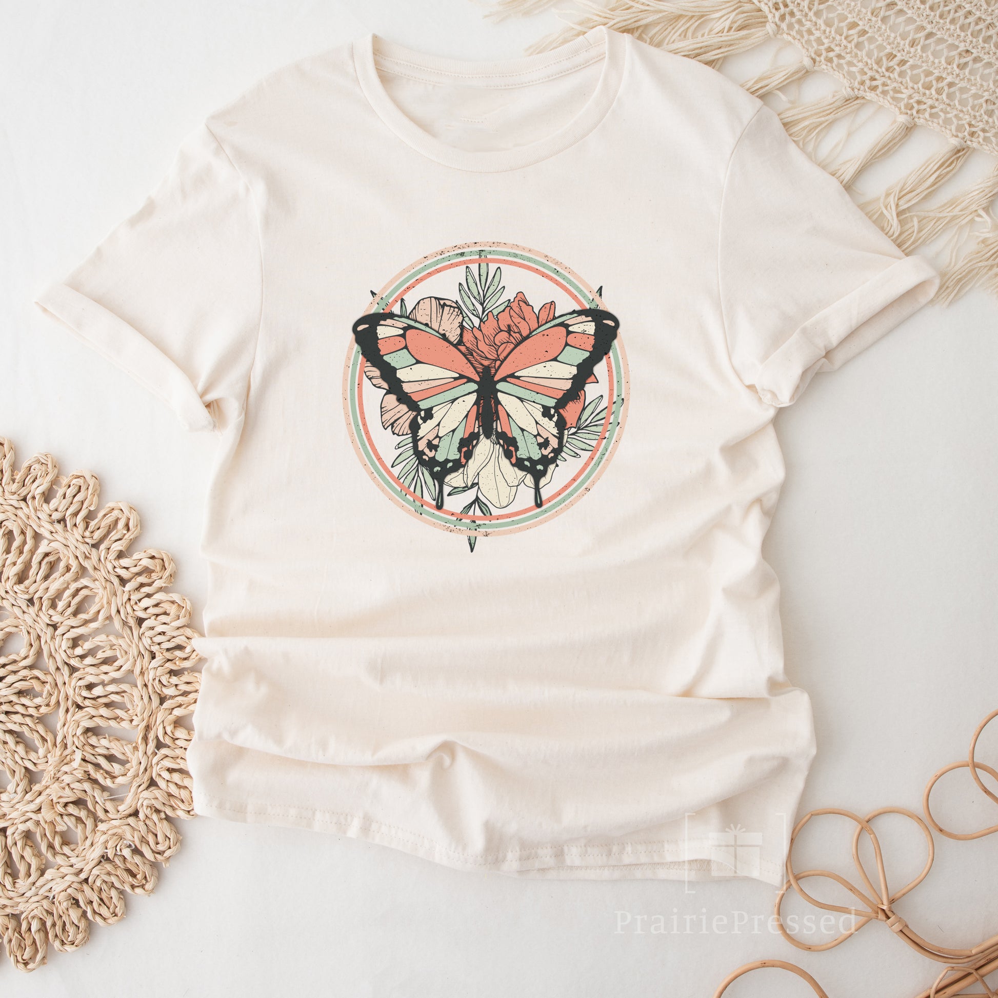 This Bella and Canvas t-shirt is perfect for the fashion-forward individual with a touch of retro style. Butterfly and Floral design brings an eye-catching, vintage-inspired aesthetic to any outfit. Crafted from a lightweight and breathable cotton blend, this shirt is sure to be a comfortable go-to in your wardrobe. Featuring a classic crew neckline and relaxed fit, this shirt is sure to keep you cool and stylish all season long.