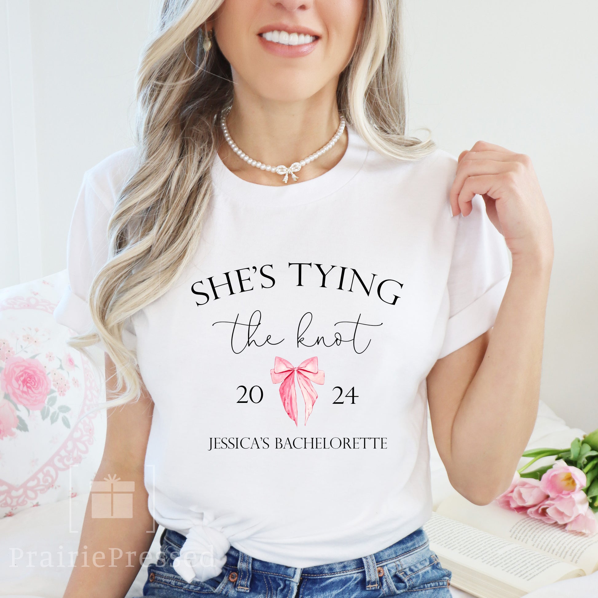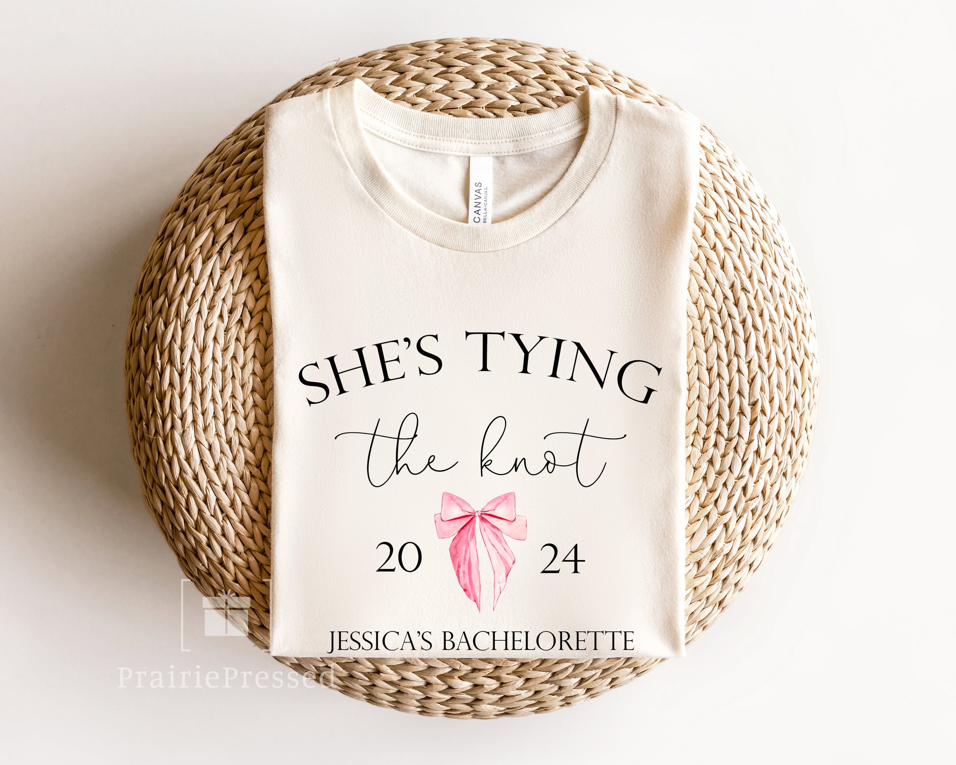 She's Tying the Knot Bachelorette T Shirt. Cute Bachelorette Party Gifts! Enter Name in Custom Field